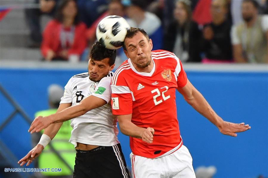 El jugador Artem Dzyuba (d), de Rusia, disputa el balón con Tarek Hamed (i), de Egipto, durante el partido del Grupo A de la Copa Mundial de la FIFA Rusia 2018, en San Petersburgo, Rusia, el 19 de junio de 2018. (Xinhua/Li Ga)