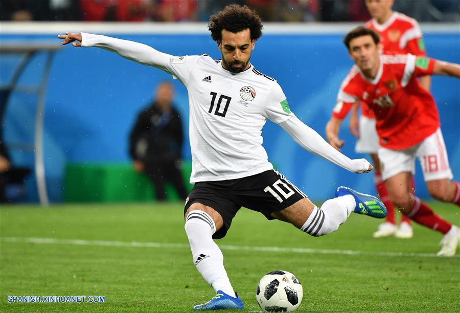 El jugador Mohamed Salah, de Egipto, cobra un penal durante el partido del Grupo A de la Copa Mundial de la FIFA Rusia 2018, ante Rusia, en San Petersburgo, Rusia, el 19 de junio de 2018. (Xinhua/Li Ga)