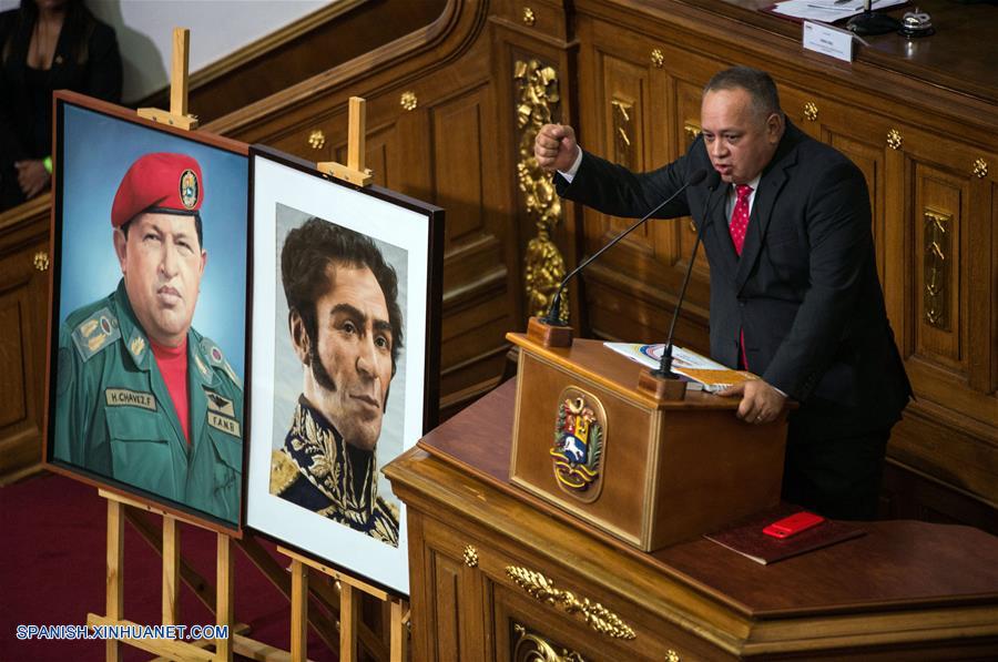 El primer vicepresidente del Partido Socialista Unido de Venezuela (PSUV), Diosdado Cabello, pronuncia un discurso luego de ser designado como presidente de la Asamblea Nacional Constituyente (ANC), en el Palacio Federal Legislativo, en Caracas, Venezuela, el 19 de junio de 2018. El primer vicepresidente del PSUV, Diosdado Cabello, prestó el martes juramento como el nuevo presidente de la ANC, tras el permiso concedido a Delcy Rodríguez para ejercer la Vicepresidencia Ejecutiva de la República. (Xinhua/Marcos Salgado)