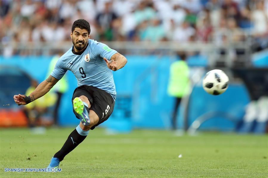 ROSTOV-DEL-DON, 20 jun (Xinhua) -- El delantero uruguayo Luis Suárez celebró su centésimo juego con su selección con el único gol del partido que llevó a Uruguay a derrotar 1-0 a Arabia Saudí en el Grupo A de la Copa Mundial de Fútbol.