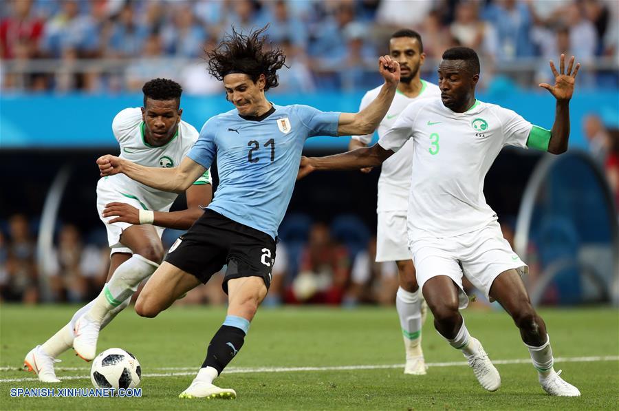 ROSTOV DEL DON, junio 20, 2018 (Xinhua) -- El jugador Edinson Cavani (2-i), de Uruguay, disputa el balón con Osama Hawsawi (d), de Arabia Saudita, durante el partido del Grupo A de la Copa Mundial de la FIFA Rusia 2018, en Rostov del Don, Rusia, el 20 de junio de 2018. (Xinhua/Lu Jinbo)
