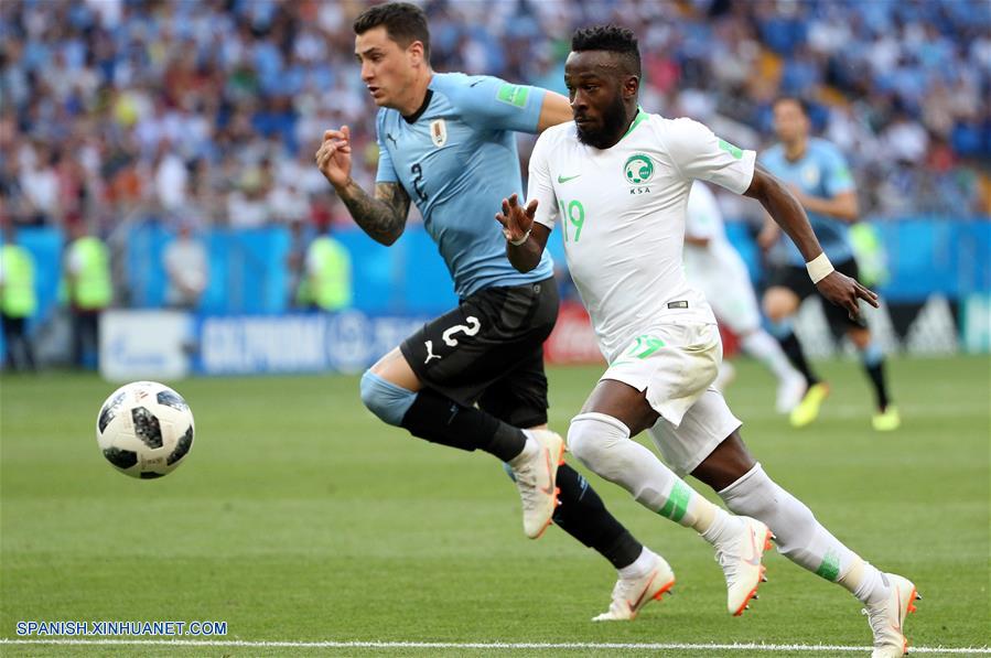 ROSTOV DEL DON, junio 20, 2018 (Xinhua) -- El jugador José Giménez (i), de Uruguay, disputa el balón con Fahad Almuwallad (d), de Arabia Saudita, durante el partido del Grupo A de la Copa Mundial de la FIFA Rusia 2018, en Rostov del Don, Rusia, el 20 de junio de 2018. (Xinhua/Li Ming)