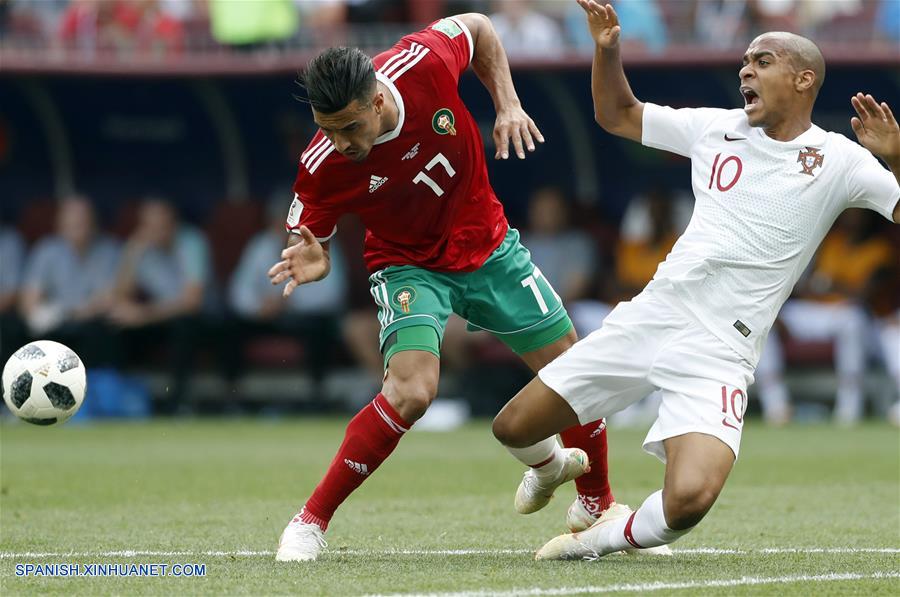 MOSCU, junio 20, 2018 (Xinhua) -- El jugador Joao Mario (d), de Portugal, disputa el balón con Nabil Dirar (i), de Marruecos, durante el partido del Grupo B de la Copa Mundial de la FIFA Rusia 2018, en Moscú, Rusia, el 20 de junio de 2018. (Xinhua/Cao Can)