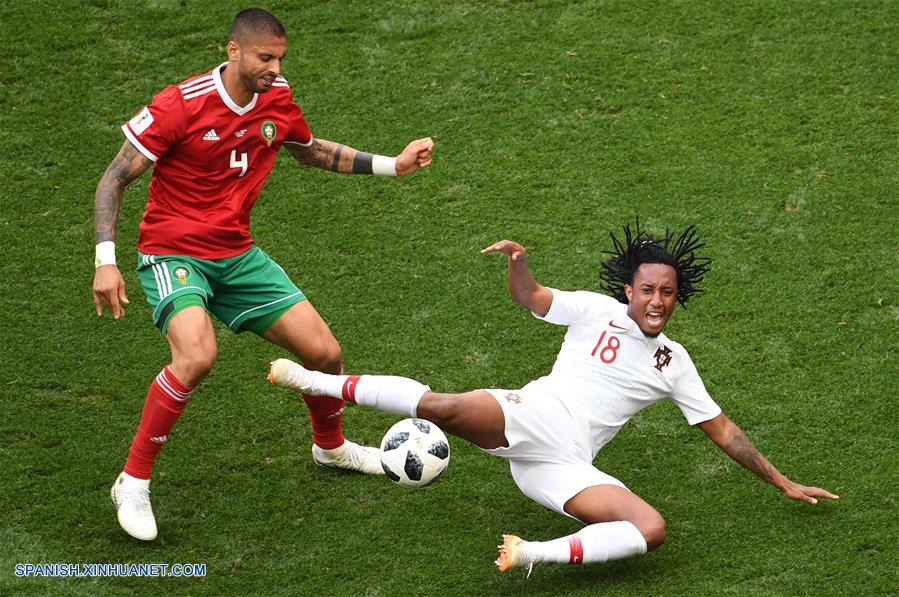MOSCU, junio 20, 2018 (Xinhua) -- El jugador Gelson Martins (d), de Portugal, disputa el balón con Manuel Da Costa (i), de Marruecos, durante el partido del Grupo B de la Copa Mundial de la FIFA Rusia 2018, en Moscú, Rusia, el 20 de junio de 2018. (Xinhua/Wang Yuguo)