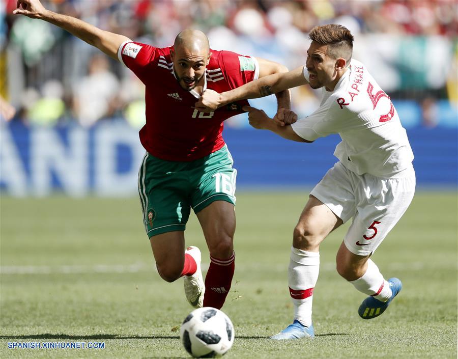 MOSCU, junio 20, 2018 (Xinhua) -- El jugador Raphael Guerreiro (d), de Portugal, disputa el balón con Noureddine Amrabat (i), de Marruecos, durante el partido del Grupo B de la Copa Mundial de la FIFA Rusia 2018, en Moscú, Rusia, el 20 de junio de 2018. (Xinhua/Cao Can)