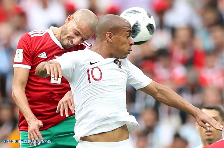 MOSCU, junio 20, 2018 (Xinhua) -- El jugador Joao Mario (d), de Portugal, disputa el balón con Karim El Ahmadi (i), de Marruecos, durante el partido del Grupo B de la Copa Mundial de la FIFA Rusia 2018, en Moscú, Rusia, el 20 de junio de 2018. (Xinhua/Xu Zijian)