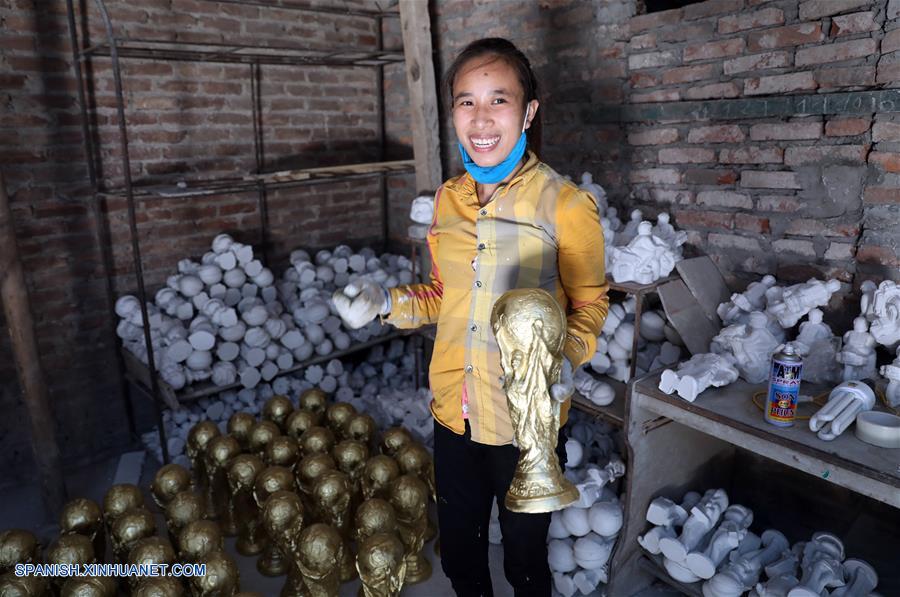 HANOI, junio 20, 2018 (Xinhua) -- Imagen del 19 de junio de 2018 de una trabajadora elaborando recuerdos de yeso del trofeo de la Copa Mundial, en la aldea de la cerámica de Bat Trang en Hanoi, capital de Vietnam. La aldea de la cerámica Bat Trang es reconocida por sus productos de cerámica de alta calidad. (Xinhua/Wang Di)