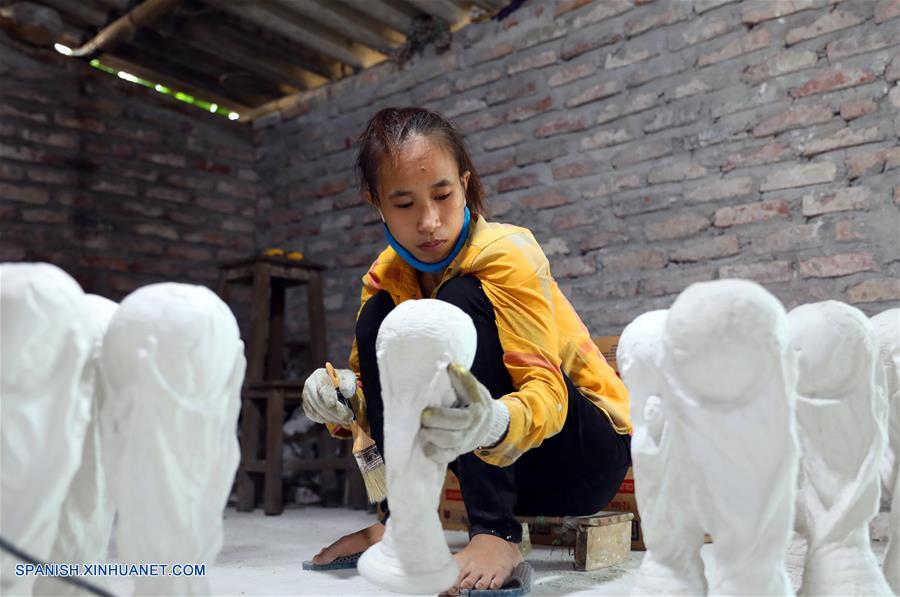 HANOI, junio 20, 2018 (Xinhua) -- Imagen del 19 de junio de 2018 de una trabajadora elaborando recuerdos de yeso del trofeo de la Copa Mundial, en la aldea de la cerámica de Bat Trang en Hanoi, capital de Vietnam. La aldea de la cerámica Bat Trang es reconocida por sus productos de cerámica de alta calidad. (Xinhua/Wang Di)