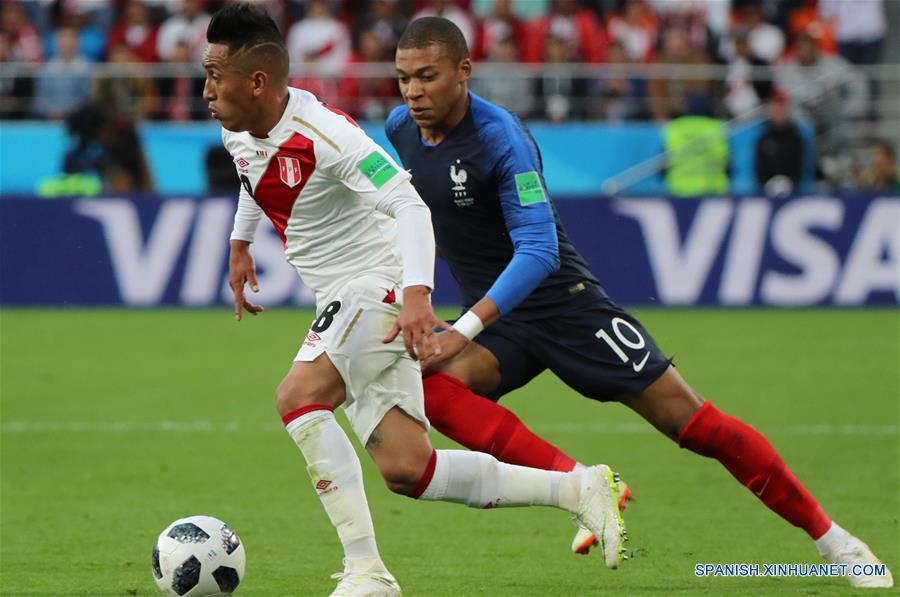 El jugador Kylian Mbappe (d), de Francia, disputa el balón con Christian Cueva (i), de Perú, durante el partido del Grupo C de la Copa Mundial de la FIFA Rusia 2018, en Ekaterimburgo, Rusia, el 21 de junio de 2018. (Xinhua/Bai Xueqi)