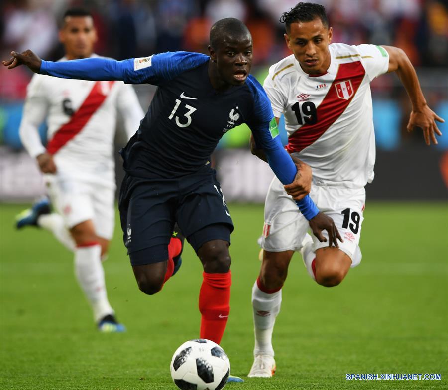El jugador Ngolo Kante (i-frente), de Francia, disputa el balón con Yoshimar Yotún (d), de Perú, durante el partido del Grupo C de la Copa Mundial de la FIFA Rusia 2018, en Ekaterimburgo, Rusia, el 21 de junio de 2018. (Xinhua/Du Yu)