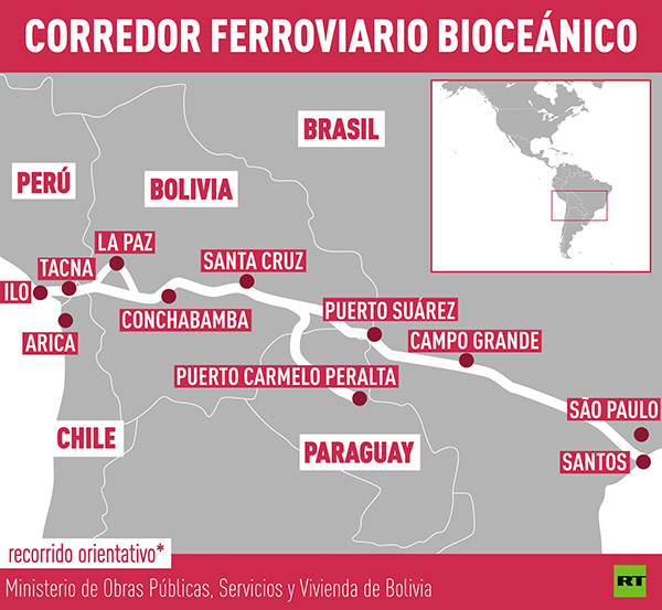 Bolivia es el proponente de la idea de unir los océanos Atlántico y Pacífico por medio de un corredor ferroviario que puede ayudar a esta nación suramericana a solventar su problema de mediterraneidad (falta de salida al mar) mientras dirime una controversia marítima con Chile.