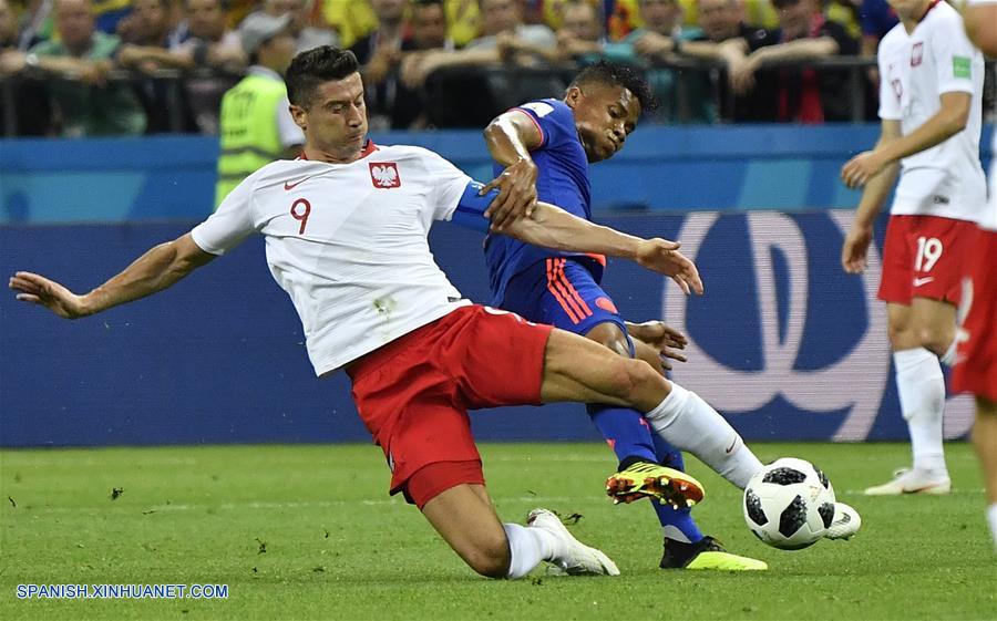 El jugador Robert Lewandowski (i), de Polonia, disputa el balón durante el partido del Grupo H de la Copa Mundial de la FIFA Rusia 2018, ante Colombia, en Kazán, Rusia, el 24 de junio de 2018. (Xinhua/He Canling)