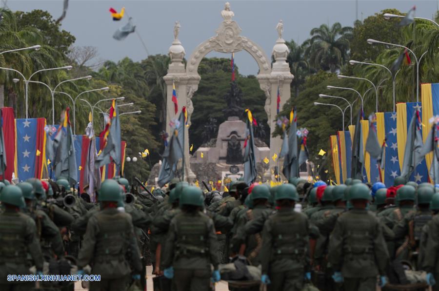 Imagen cedida por la Presidencia de Venezuela de elementos de la Fuerza Armada Nacional Bolivariana (FANB), participando en el acto conmemorativo por el 197 aniversario de la Batalla de Carabobo y día del Ejército Nacional Bolivariano, en el Campo Carabobo, en Carabobo, Venezuela, el 24 de junio de 2018. El presidente de Venezuela, Nicolás Maduro, alertó el domingo sobre una operación en contra del país, desde Bogotá, por parte de políticos y militares retirados, por lo que llamó a la Fuerza Armada Nacional Bolivariana (FANB) a cuidar la capacidad de defensa de la patria. El mandatario venezolano hizo esta afirmación durante el desfile cívico militar en conmemoración de los 197 a?os de la Batalla de Carabobo y el Día del Ejército Nacional Bolivariano. (Xinhua/Presidencia de Venezuela)
