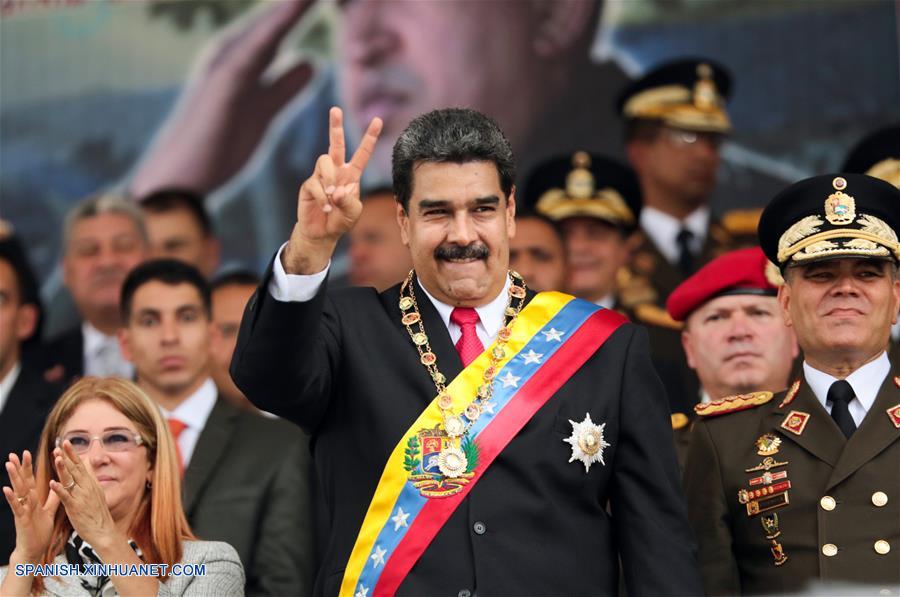 Imagen cedida por la Presidencia de Venezuela del presidente venezolano, Nicolás Maduro (c), participando en en el acto conmemorativo por el 197 aniversario de la Batalla de Carabobo y día del Ejército Nacional Bolivariano, en el Campo Carabobo, en Carabobo, Venezuela, el 24 de junio de 2018. (Xinhua/Presidencia de Venezuela)