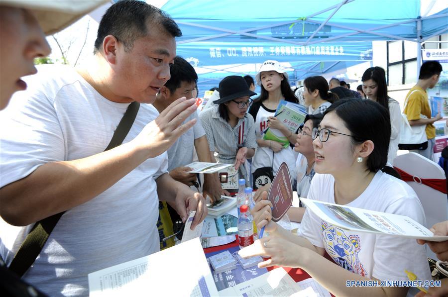 Graduados de preparatoria y sus padres asisten a una asesoría de inscripción en la Universidad Normal de Fuyang, en Fuyang, provincia de Anhui, en el este de China, el 25 de junio de 2018. Las instituciones de educación superior de China comenzaron a proveer asesorías para la inscripción de los graduados de preparatoria después del Examen Nacional de Ingreso a la Universidad, o "gaokao". (Xinhua/Dai Wenxue)