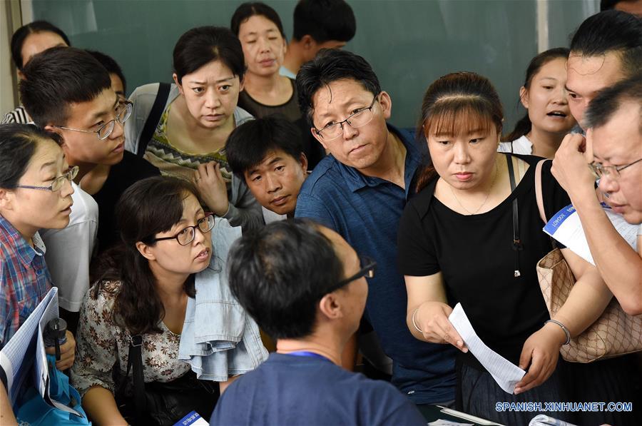 HEBEI, junio 25, 2018 (Xinhua) -- Graduados de preparatoria y sus padres asisten a una asesoría de inscripción en Handan, provincia de Hebei, en el norte de China, el 25 de junio de 2018. Las instituciones de educación superior de China comenzaron a proveer asesorías para la inscripción de los graduados de preparatoria después del Examen Nacional de Ingreso a la Universidad, o "gaokao". (Xinhua/Hao Qunying)