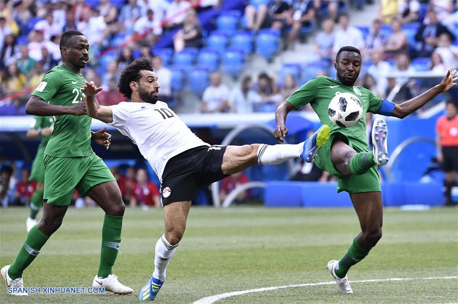 El jugador Mohammed Salah (c), de Egipto, dispara el balón durante el partido del Grupo A de la Copa Mundial de la FIFA Rusia 2018, ante Arabia Saudita, en Volgogrado, Rusia, el 25 de junio de 2018. (Xinhua/Chen Yichen)