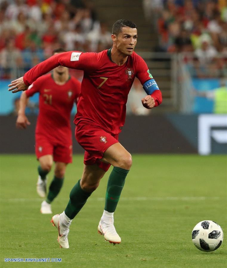 El jugador Cristiano Ronaldo (frente), de Portugal, controla el balón durante el partido del Grupo B de la Copa Mundial de la FIFA Rusia 2018, ante Irán, en Saransk, Rusia, el 25 de junio de 2018. (Xinhua/Ye Pingfan)