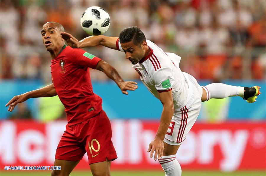 El jugador Omid Ebrahimi (d), de Irán, disputa el balón con Joao Mario (i), de Portugal, durante el partido del Grupo B de la Copa Mundial de la FIFA Rusia 2018, en Saransk, Rusia, el 25 de junio de 2018. (Xinhua/Fei Maohua)