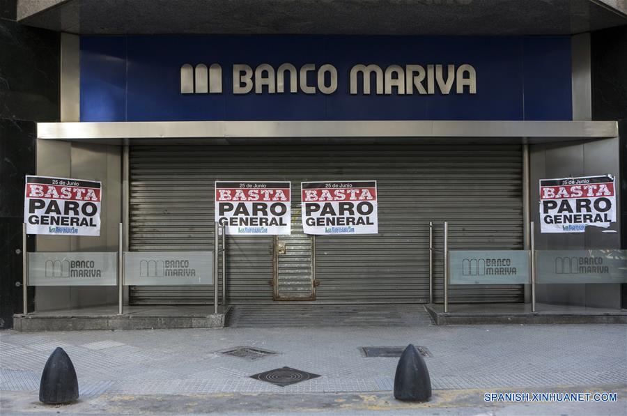 Una sucursal bancaria permanece cerrada durante una huelga general, en Buenos Aires, capital de Argentina, el 25 de junio de 2018. Una huelga general de 24 horas, convocada por la Confederación General del Trabajo (CGT) en reclamo de mejoras salariales y en rechazo a la política económica del gobierno argentino, se inició el lunes en todo el país desde las 00:00 horas. (Xinhua/Martín Zabala)