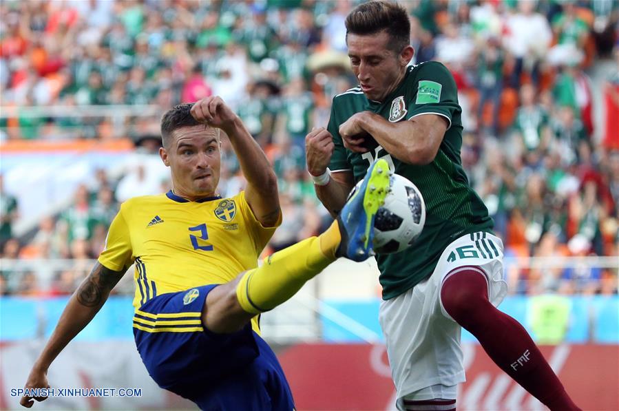 El jugador Héctor Herrera (d), de México, disputa el balón con Mikael Lustig (i), de Suecia, durante el partido del Grupo F de la Copa Mundial de la FIFA Rusia 2018, en Ekaterimburgo, Rusia, el 27 de junio de 2018. (Xinhua/Li Ming)