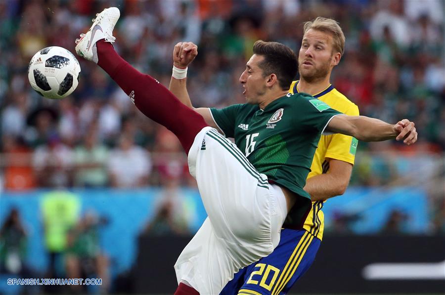 El jugador Héctor Herrera (frente), de México, disputa el balón con Ola Toivonen (d), de Suecia, durante el partido del Grupo F de la Copa Mundial de la FIFA Rusia 2018, en Ekaterimburgo, Rusia, el 27 de junio de 2018. (Xinhua/Li Ming)