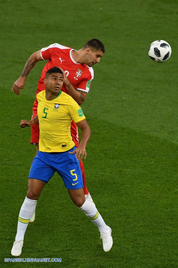 El jugador Aleksandar Mitrovic (atrás) de Serbia, disputa el balón con Casemiro (frente), de Brasil, durante el partido del Grupo E de la Copa Mundial de la FIFA Rusia 2018, en Moscú, Rusia, el 27 de junio de 2018. (Xinhua/Wang Yuguo)