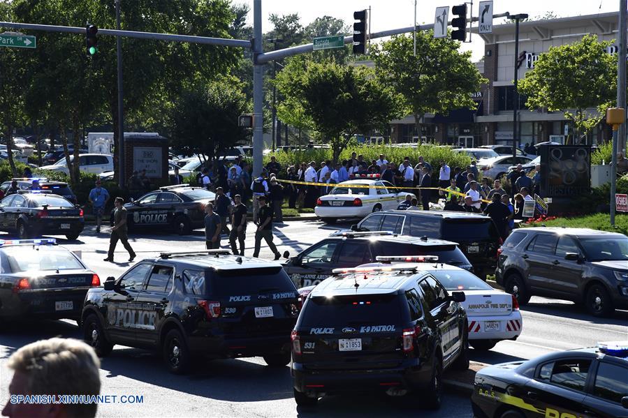 Oficiales de policía vigilan la escena de un tiroteo masivo en Annapolis, capital del estado de Maryland, Estados Unidos, el 28 de junio de 2018. Cinco personas murieron y varias quedaron "heridas de gravedad" el jueves en un tiroteo masivo ocurrido en la sede del diario local Capital Gazette in Annapolis, capital del estado de Maryland, en el este de Estados Unidos, indicó la policía. (Xinhua/Yang Chenglin)