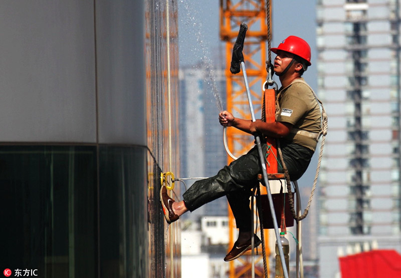 Chen Zhenzhen, de 29 a?os e hijo de Chen Maoqing, limpia la fachada de un edificio en Nanchang, provincia de Jiangxi, 28 de junio del 2018. [Foto: IC]