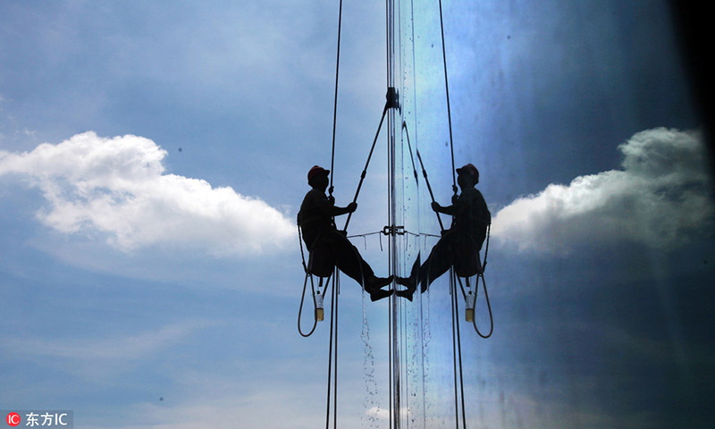 Chen Zhenzhen, de 29 a?os e hijo de Chen Maoqing, limpia la fachada de un edificio en Nanchang, provincia de Jiangxi, 28 de junio del 2018. [Foto: IC]