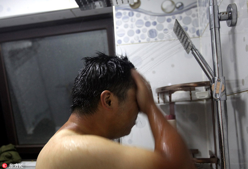 Chen Zhenzhen se ducha después de terminar la jornada laboral. Nanchang, provincia de Jiangxi, 28 de junio del 2018. [Foto: IC]