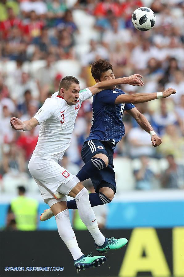 El jugador Hiroki Sakai (d), de Japón, disputa el balón con Artur Jedrzejczyk (i), de Polonia, durante el partido del Grupo H de la Copa Mundial de la FIFA Rusia 2018, en Volgogrado, Rusia, el 28 de junio de 2018. (Xinhua/Wu Zhuang)