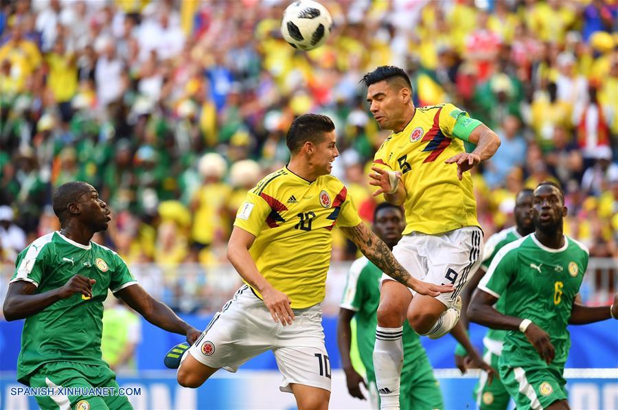 El jugador Radamel Falcao (2-d), de Colombia, cabecea el balón durante el partido del Grupo H de la Copa Mundial de la FIFA Rusia 2018, ante Senegal, en Samara, Rusia, el 28 de junio de 2018. (Xinhua/Liu Dawei)