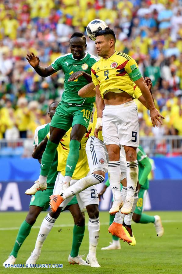 El jugador Sadio Mane (i), de Senegal, disputa el balón con Radamel Falcao (d), de Colombia, durante el partido del Grupo H de la Copa Mundial de la FIFA Rusia 2018, en Samara, Rusia, el 28 de junio de 2018. (Xinhua/Liu Dawei)