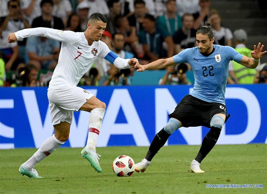 El jugador Martín Cáceres (d), de Uruguay, disputa el balón con Cristiano Ronaldo (i), de Portugal, durante el partido de octavos de final de la Copa Mundial de la FIFA Rusia 2018, en Sochi, Rusia, el 30 de junio de 2018. (Xinhua/Chen Cheng)