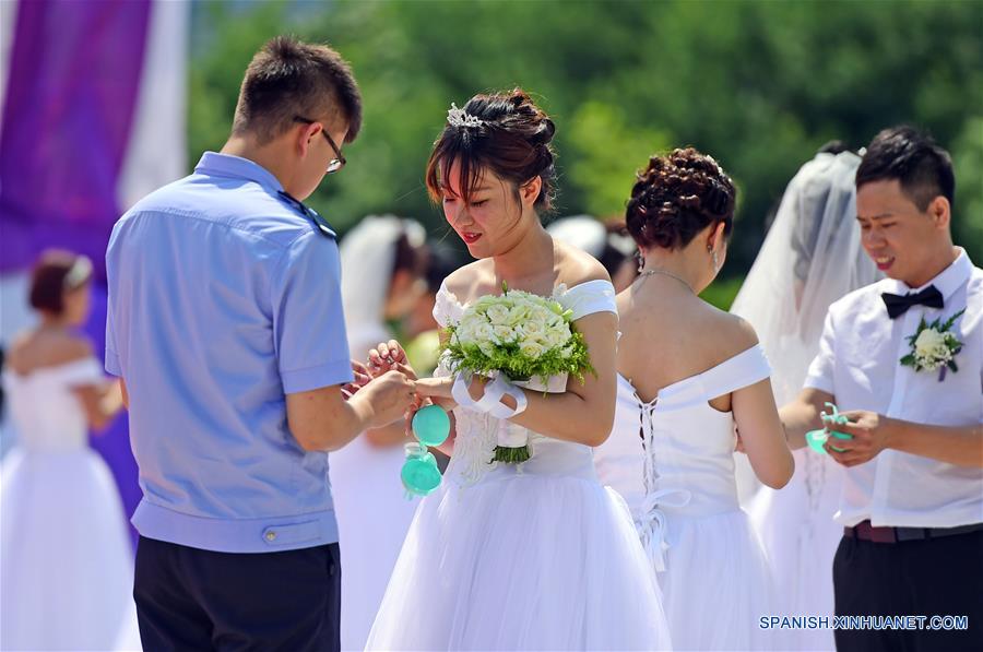 LIAONING, junio 30, 2018 (Xinhua) -- Parejas intercambian símbolos de amor mientras al casarse durante una ceremonia de boda grupal llevada a cabo frente al Gran Teatro Shengjin, en Shenyang, provincia de Liaoning, en el noreste de China, el 30 de junio de 2018. La boda grupal fue llevada a cabo para 27 parejas de todas las condiciones sociales. (Xinhua/Yang Qing)