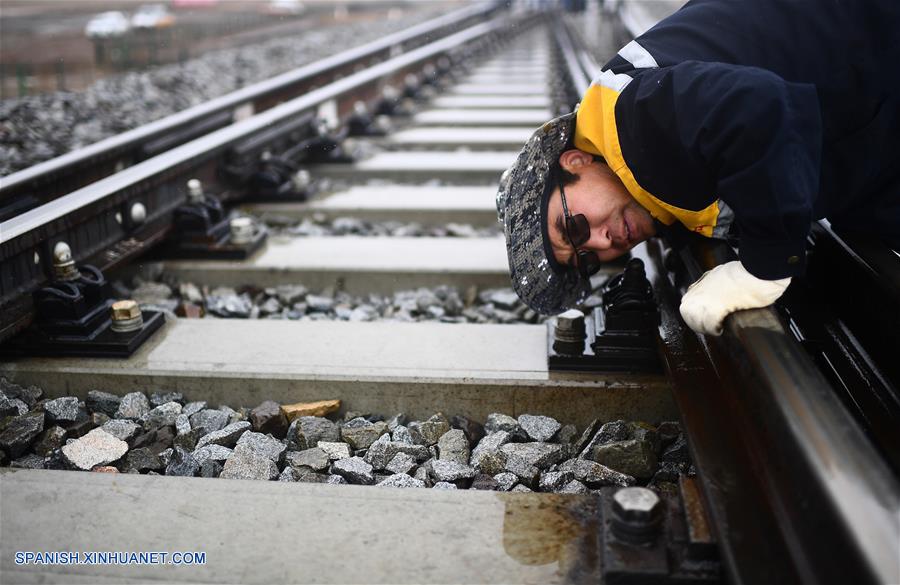 QINGHAI, julio 1, 2018 (Xinhua) -- Imagen del 30 de junio de 2018 de un trabajador revisando las condiciones de las vías cerca de la Estación Tanggula de la vía férrea Qinghai-Tíbet, provincia de Qinghai, en el noroeste de China. Trabajadores de mantenimiento permanecen en sus puestos todos los días para garantizar la operación de la vía férrea Qinghai-Tíbet, en la Estación Tanggula, con una altitud de 5,072 metros sobre el nivel del mar. (Xinhua/Zhang Hongxiang)