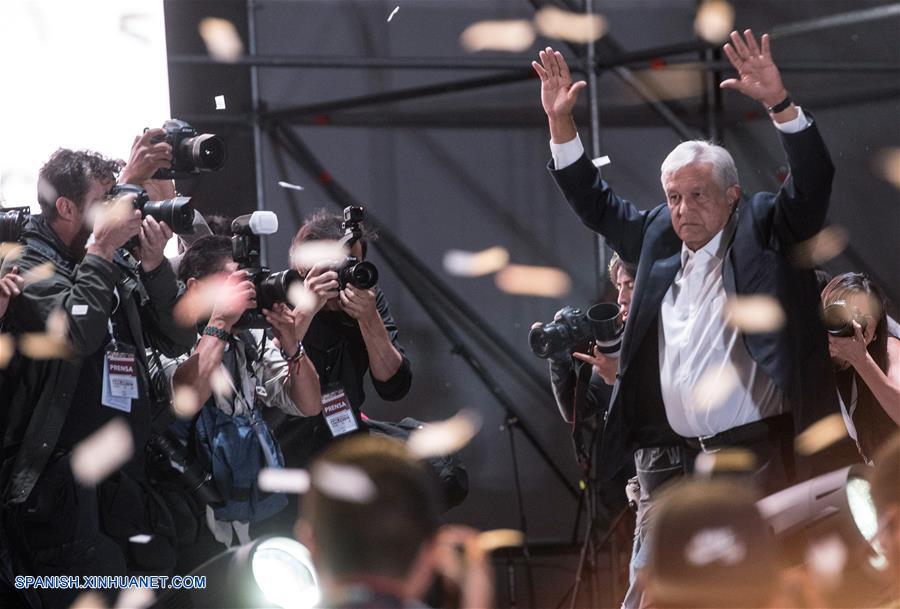 CIUDAD DE MEXICO, julio 2, 2018 (Xinhua) -- El candidato a la Presidencia de México por la coalición "Juntos Haremos Historia", Andrés Manuel López Obrador (d), reacciona en el Zócalo de la Ciudad de México, capital de México, el 2 de julio de 2018. El candidato de la coalición "Juntos haremos historia", Andrés Manuel López Obrador, convocó el domingo a la reconciliación a los ciudadanos mexicanos, tras los resultados preliminares que apuntan a su virtual triunfo de las elecciones presidenciales.(Xinhua/Alejandro Meléndez)
