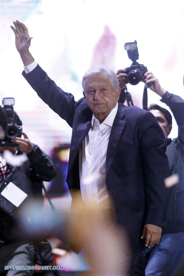 CIUDAD DE MEXICO, julio 2, 2018 (Xinhua) -- El candidato a la Presidencia de México por la coalición "Juntos Haremos Historia", Andrés Manuel López Obrador, festeja su triunfo en las elecciones presidenciales, en el Zócalo de la Ciudad de México, capital de México, el 2 de julio de 2018. El candidato de la coalición "Juntos haremos historia", Andrés Manuel López Obrador, convocó el domingo a la reconciliación a los ciudadanos mexicanos, tras los resultados preliminares que apuntan a su virtual triunfo de las elecciones presidenciales.(Xinhua/Ricardo Aldayturriaga)