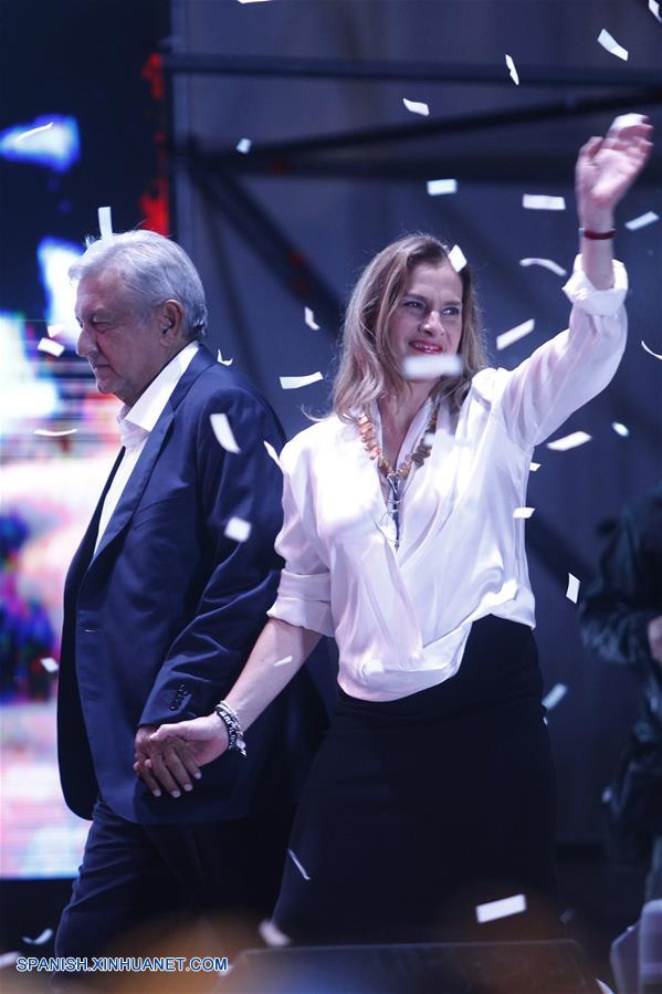 CIUDAD DE MEXICO, julio 2, 2018 (Xinhua) -- El candidato a la Presidencia de México por la coalición "Juntos Haremos Historia", Andrés Manuel López Obrador (i), festeja su triunfo en las elecciones presidenciales junto a su esposa Beatriz Gutiérrez Mueller (d), en el Zócalo de la Ciudad de México, capital de México, el 2 de julio de 2018. El candidato de la coalición "Juntos haremos historia", Andrés Manuel López Obrador, convocó el domingo a la reconciliación a los ciudadanos mexicanos, tras los resultados preliminares que apuntan a su virtual triunfo de las elecciones presidenciales.(Xinhua/Ricardo Aldayturriaga)