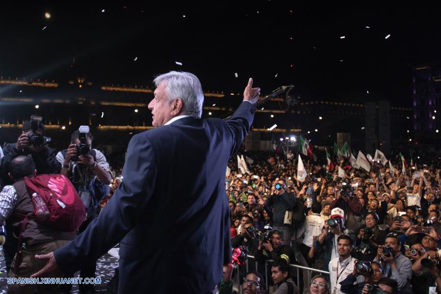 CIUDAD DE MEXICO, julio 2, 2018 (Xinhua) -- El candidato a la Presidencia de México por la coalición "Juntos Haremos Historia", Andrés Manuel López Obrador, reacciona en el Zócalo de la Ciudad de México, capital de México, el 2 de julio de 2018. El candidato de la coalición "Juntos haremos historia", Andrés Manuel López Obrador, convocó el domingo a la reconciliación a los ciudadanos mexicanos, tras los resultados preliminares que apuntan a su virtual triunfo de las elecciones presidenciales. (Xinhua/Alejandro Ayala)