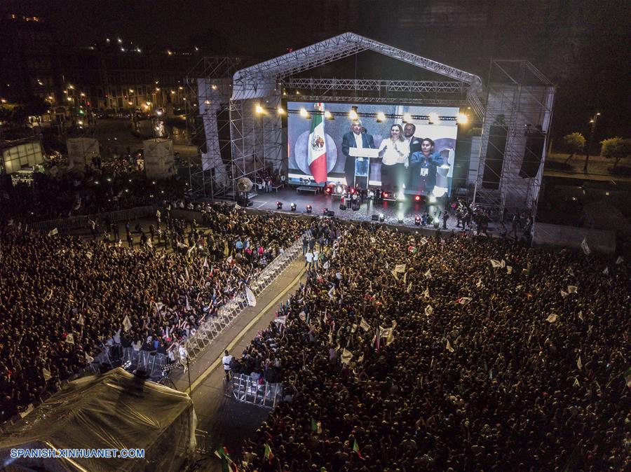 CIUDAD DE MEXICO, julio 2, 2018 (Xinhua) -- El candidato a la Presidencia de México por la coalición "Juntos Haremos Historia", Andrés Manuel López Obrador, reacciona en el Zócalo de la Ciudad de México, capital de México, el 2 de julio de 2018. El candidato de la coalición "Juntos haremos historia", Andrés Manuel López Obrador, convocó el domingo a la reconciliación a los ciudadanos mexicanos, tras los resultados preliminares que apuntan a su virtual triunfo de las elecciones presidenciales. (Xinhua/Alejandro Ayala)
