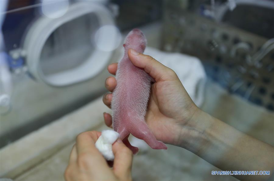 Una persona limpia a una cría de panda gigante en la Base de Investigación para la Cría del Panda Gigante de Chengdu, provincia de Sichuan, en el suroeste de China, el 2 de julio de 2018. Dos crías gemelas, una hembra y un macho, de oso panda nacieron el lunes por la ma?ana en la provincia de Sichuan en el suroeste de China. (Xinhua/Str)