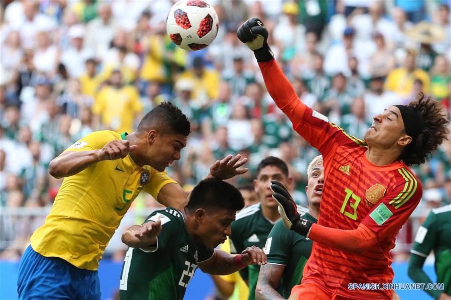 El jugador Casemiro (i), de Brasil, disputa el balón con el guardameta Guillermo Ochoa (d-frente) y Jesús Gallardo (c), de México, durante el partido de octavos de final de la Copa Mundial de la FIFA Rusia 2018, en Samara, Rusia, el 2 de julio de 2018. (Xinhua/Li Ming)