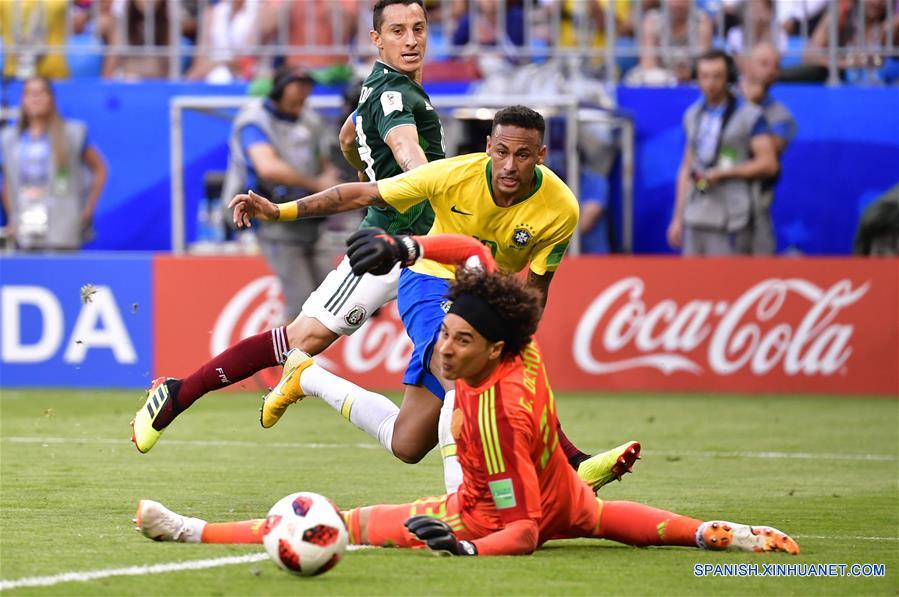 El jugador Neymar (c), de Brasil, dispara el balón para marcar su anotación durante el partido de octavos de final de la Copa Mundial de la FIFA Rusia 2018, ante México, en Samara, Rusia, el 2 de julio de 2018. (Xinhua/Chen Yichen)