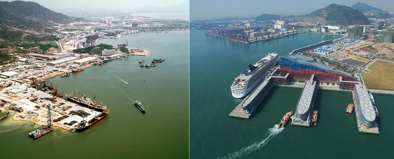 La parte superior (archivo) es una foto que muestra el puerto Shekou de Shenzhen, provincia de Guangdong. La foto inferior tomada por Mao Siqian el 16 de noviembre del 2016 muestra la terminal de cruceros Taiziwan en el puerto de Shenzhen. Este a?o se conmemora el 40 aniversario de la política de reforma y apertura de China. En las últimas cuatro décadas, Shenzhen se ha desarrollado desde su condición de peque?o puerto pesquero hasta convertirse en una metrópolis global. (Foto: Xinhua)