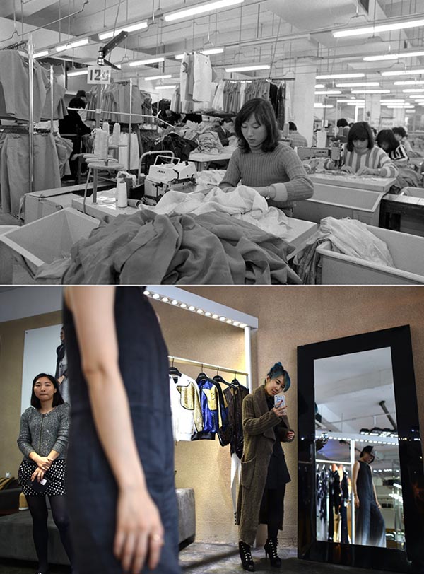La parte superior (archivo) es una foto tomada por Duan Wenhua que muestra a los empleados trabajando en una fábrica de ropa de Shenzhen, provincia de Guangdong. La foto inferior tomada por Mao Siqian el 28 de marzo del 2015 muestra al dise?ador de moda Lu Yu (a la derecha) en su estudio de Shenzhen. Este a?o se conmemora el 40 aniversario de la política de reforma y apertura de China. En las últimas cuatro décadas, Shenzhen se ha desarrollado desde su condición de peque?o puerto pesquero hasta convertirse en una metrópolis global. (Foto: Xinhua)