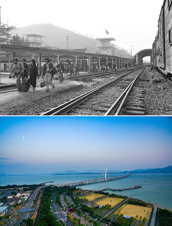 La parte superior (archivo) es una foto tomada por Li Changyong que muestra a los pasajeros en un puerto entre Shenzhen y Hong Kong. La foto inferior tomada por Mao Siqian el 9 de febrero del 2017 muestra un puente de la bahía de Shenzhen. Este a?o se conmemora el 40 aniversario de la política de reforma y apertura de China. En las últimas cuatro décadas, Shenzhen se ha desarrollado desde su condición de peque?o puerto pesquero hasta convertirse en una metrópolis global. (Foto: Xinhua)