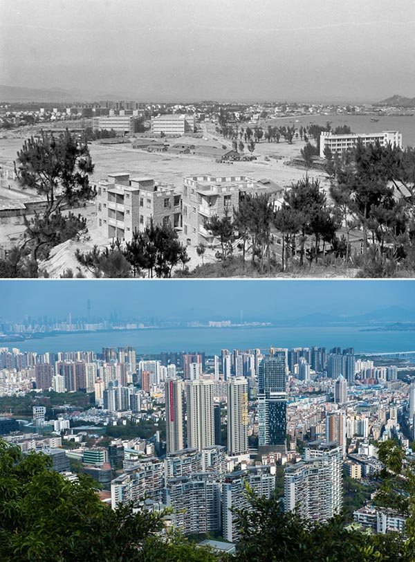 La parte superior (archivo) es una foto tomada por Li Changyong que muestra una zona industrial de Shekou en Shenzhen, provincia de Guangdong. La foto inferior tomada por Mao Siqian el 26 de febrero del 2015 muestra la zona franca piloto de Shekou en Shenzhen. Este a?o se conmemora el 40 aniversario de la política de reforma y apertura de China. En las últimas cuatro décadas, Shenzhen se ha desarrollado desde su condición de peque?o puerto pesquero hasta convertirse en una metrópolis global. (Foto: Xinhua)