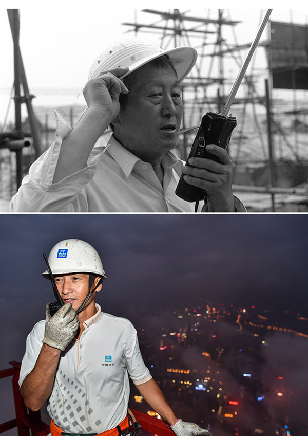 La parte superior (archivo) es una foto tomada por Li Changyong que muestra a Jiang Weishui trabajando en la construcción de un centro para el comercio internacional en Shenzhen, provincia de Guangdong. La foto inferior tomada por Mao Siqian el 18 de abril del 2015 muestra a Wang Hua trabajando en la construcción del centro financiero internacional de Ping'an en Shenzhen. Este a?o se conmemora el 40 aniversario de la política de reforma y apertura de China. En las últimas cuatro décadas, Shenzhen se ha desarrollado desde su condición de peque?o puerto pesquero hasta convertirse en una metrópolis global. (Foto: Xinhua)